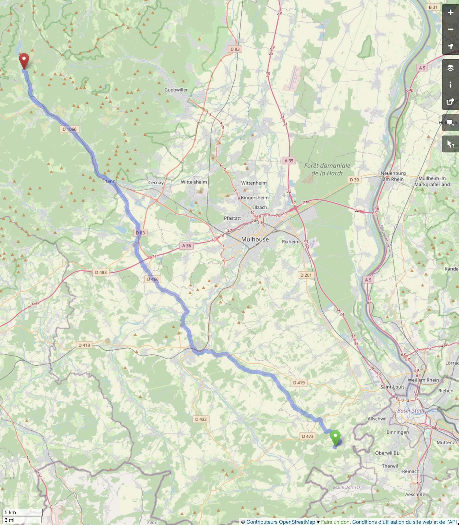 Pour donner une idée du trajet, donné par défaut sur Openstreetmap. J’ai préféré passer par Waldighoffen, un léger détour pour éviter la « route haute » et son trafic automobile un peu rapide à mon goût…