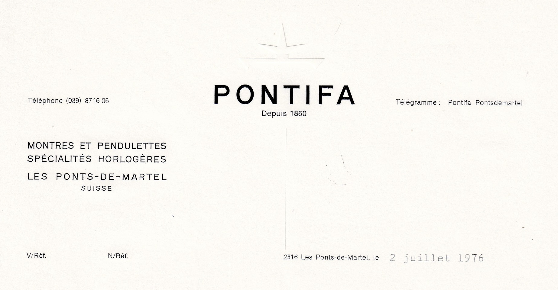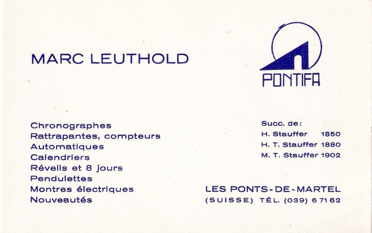 Cette carte de visite spécifie les 4 générations d’horlogers. Un papier à en-tête de Pontifa indique « Depuis 1850 » (voir ci-dessous), par contre je ne sais pas si le nom a vraiment été créé en 1850 (j’en doute, comme Marc-Timothée était connu sous son nom, d’après ce carton de présentation), ou si c’est le démarrage par Henri Stauffer de cette transmission familiale qui faisait remonter cette tradition horlogère dans la famille à 1850.