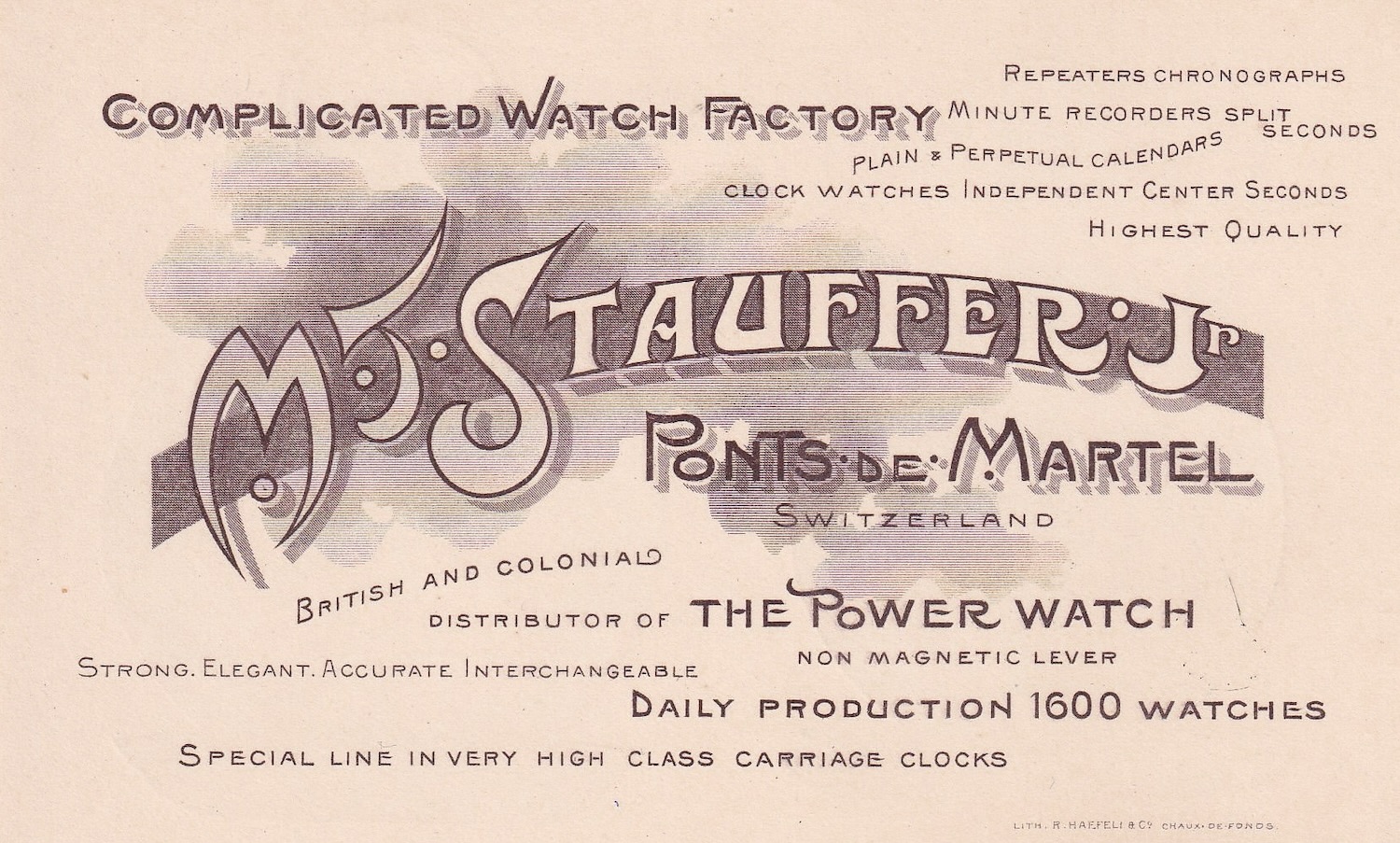 Ci-dessus, carton de présentation de la fabrique de montres à complications de Marc-Timothée Stauffer, né en 1874, frère de mon arrière-grand-mère Laure-Margerite Stauffer (1875-1950).