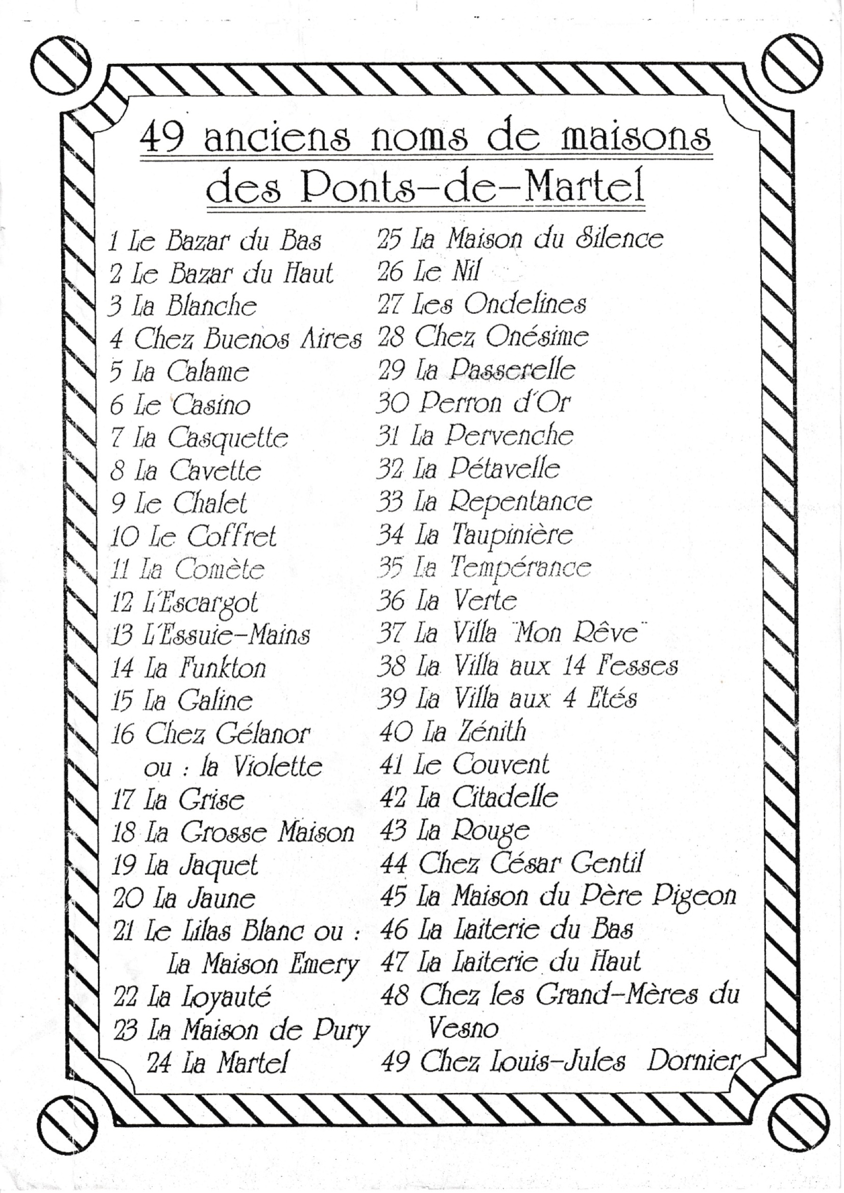 Voici en format texte, indexable, la liste des 49 anciens noms de maisons des Ponts-de-Martel :