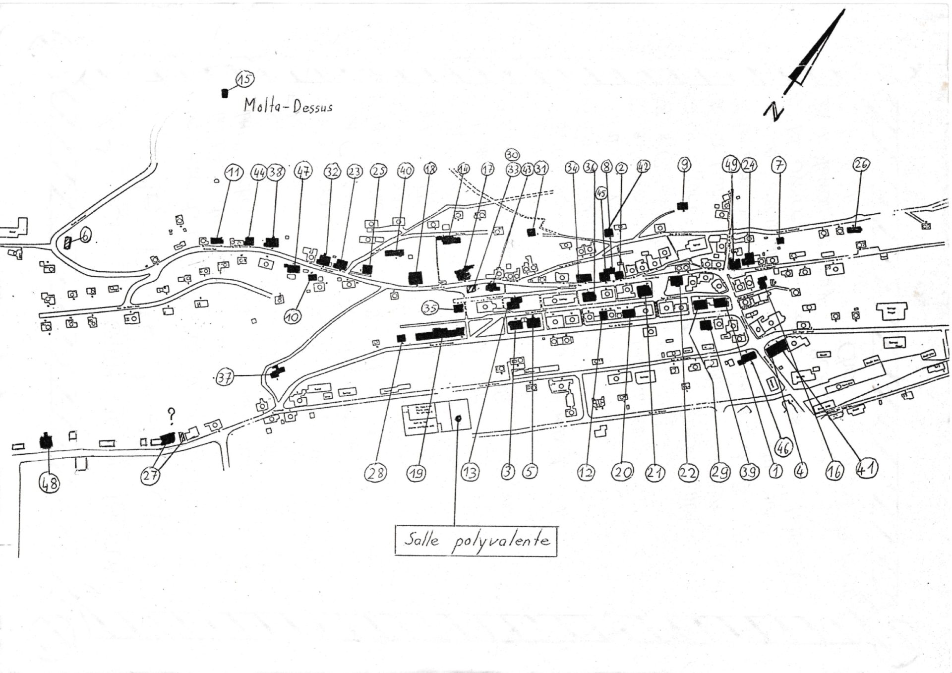 En triant des affaires de famille, j’ai mis la main sur une feuille A4 recto-verso avec « 49 anciens noms de maisons des Ponts-de-Martel » : au recto la liste des 49 noms, avec numéros ; au verso, un plan les positionnant (voir scans sur cette page). Je n’ai aucune idée de l’origine de cette feuille, à part qu’elle est certainement des Ponts, puisque c’est notre village d’origine.